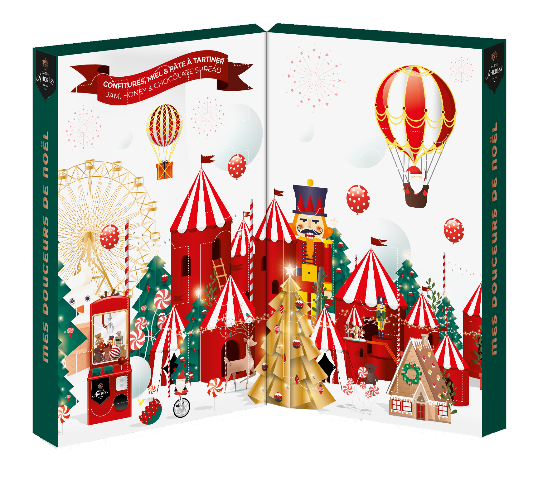 En kalender fylld med 20 marmelader i 10 olika smaker, 2 hasselnötskräm och 2 honung (ca 28g/glasburk).