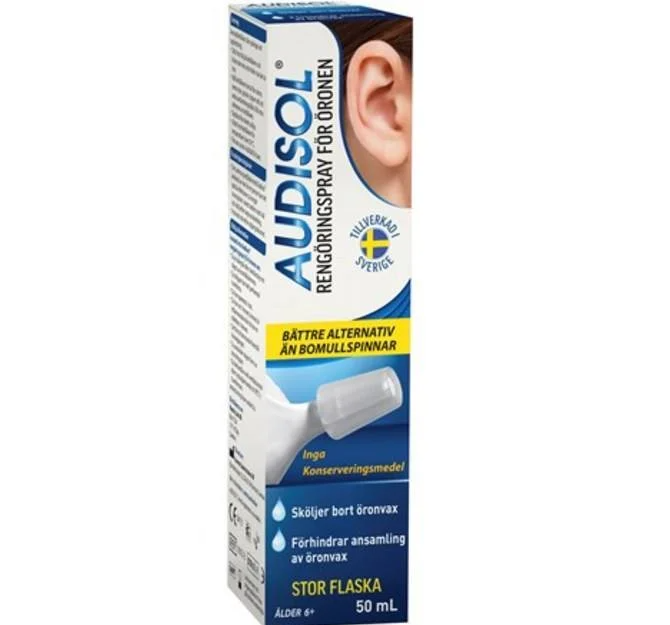 Audisol® Spray är ett effektivt sätt att skölja bort öronvax och förhindra ansamling av nytt vax, vilket gör det till ett bättre alternativ än bomullspinnar. Audisol® bidrar till att hålla hörselgångarna rena och fria från vax, vilket är särskilt fördelaktigt för personer som använder hörapparater eller öronproppar. För vuxna och barn över 3 år. Produkten är säker att använda vid graviditet och amning.