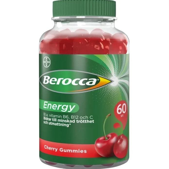 Ingredienser: Glukossirap, socker, gelatin, vitamin C, vitamin E, niacin, biotin, vitamin A, vegetabilisk olja (palm- och palmkärnolja), koncentrat av morot och svarta vinbär, vitamin B6, vitamin D, arom (körsbär), vitamin B2, vitamin B1, vitamin B12, ytbehandlingsmedel (bivax, karnaubavax). Produktens ingredienslista kan uppdateras över tid. Konsultera alltid ingredienslistan som finns på den köpta produktens förpackning.