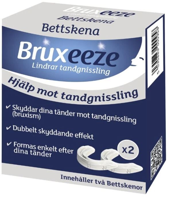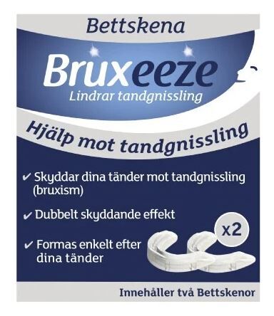 Bettskenan formas enkelt efter dina tänder och går att forma om flera gånger. De flesta föredrar att forma bettskenan efter tänderna i underkäken. Gör så här: Fyll en skål med 1 dl kallt vatten. Koka upp 4 dl vatten och häll det i skålen, som nu alltså innehåller totalt 5 dl vatten. Lägg bettskenan i skålen och låt den ligga i 2,5 minut för att mjukna. Använd en gaffel för att ta upp bettskenan ur vattnet. Placera bettskenan mot tänderna i över- eller underkäken (de flesta föredrar att forma skenan efter underkäken) och kontrollera att tänderna är inom kanterna. Bit ihop ordentligt. Använd fingrarna för att pressa bettskenan mot tänderna för att få en bra passform. Behåll skenan i munnen i 2 minuter. Ta försiktigt ut bettskenan ur munnen och skölj den under rinnande kallt vatten i 30 sekunder så att den stelnar. Placera skenan i munnen och se så att den har bra passform. Då är den klar att användas! (Om passformen inte är bra kan du göra om proceduren för att forma om den.) 2 st bettskenor, ska användas en åt gången.