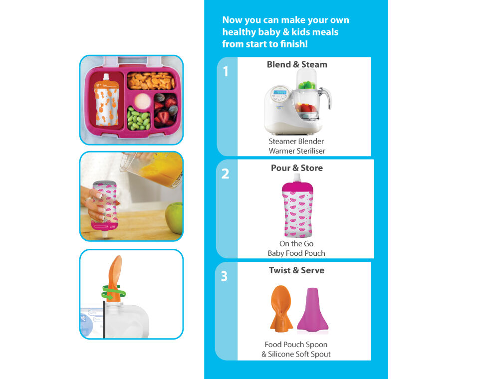 Barnen älskar att äta ur dem och med skedarna som säljs som tillbehör kan även mindre barn matas direkt. Påsen är tillverkad av stark plast som tål tuffa tag och en hållbar Zipförslutning som till och med håller tätt för vätska!