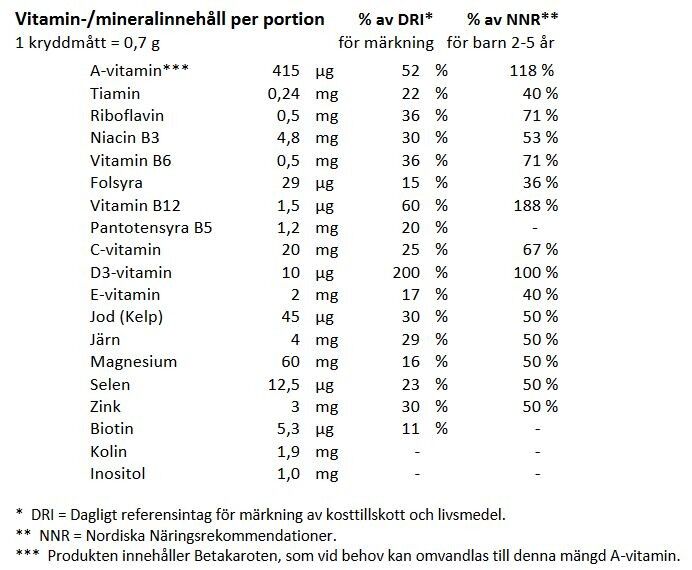 Barn 2-5 år: 1 kryddmått (1 ml) per dag.