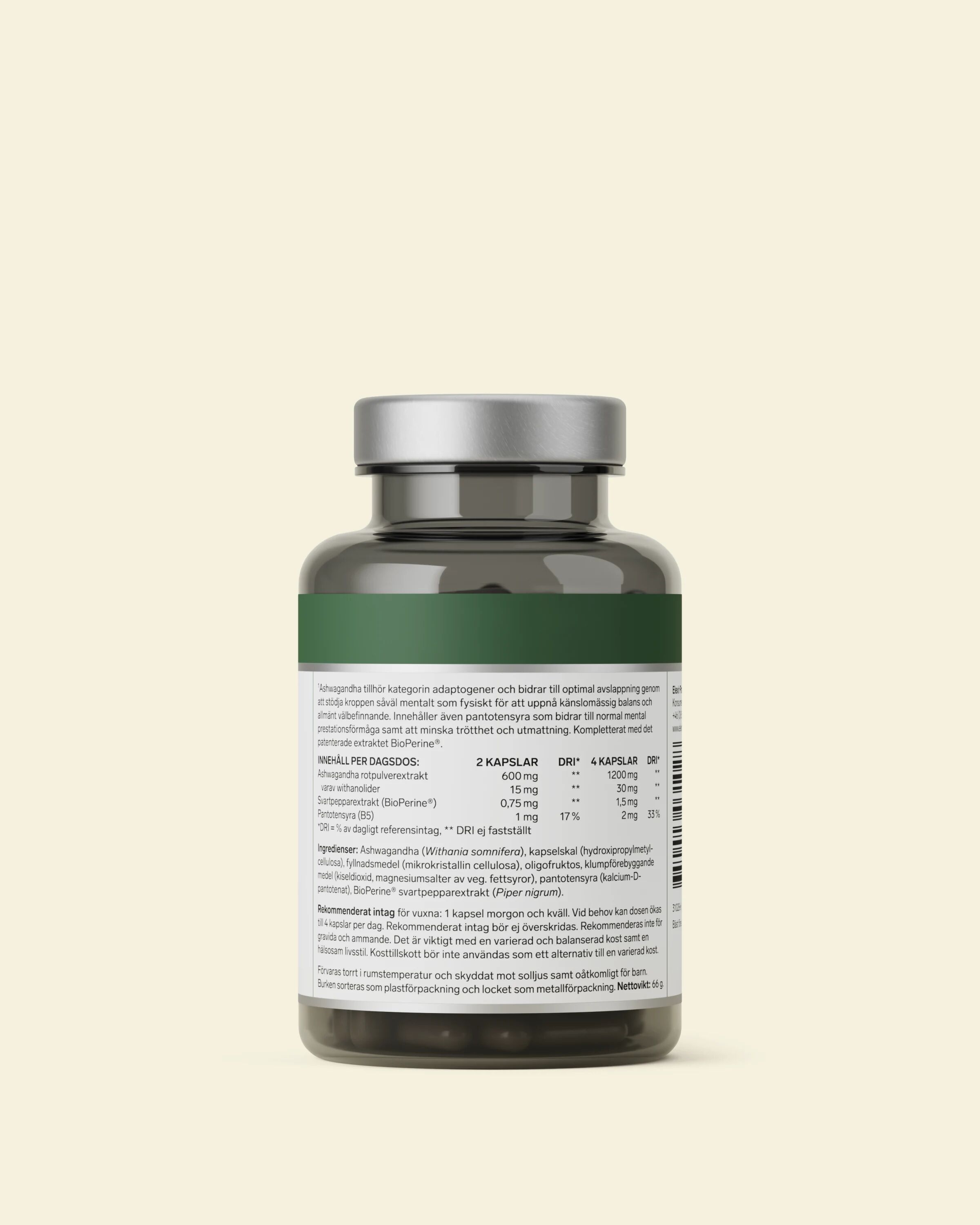 Ingredienser: Ashwaganda rotpulverextrakt 1x10 (från Withania somnifera-rot, standardiserad påwithanolider), fyllnadsmedel (mikrokristallin cellulosa), vegetabilisk kapsel (hydroxypropylmetylcellulosa).