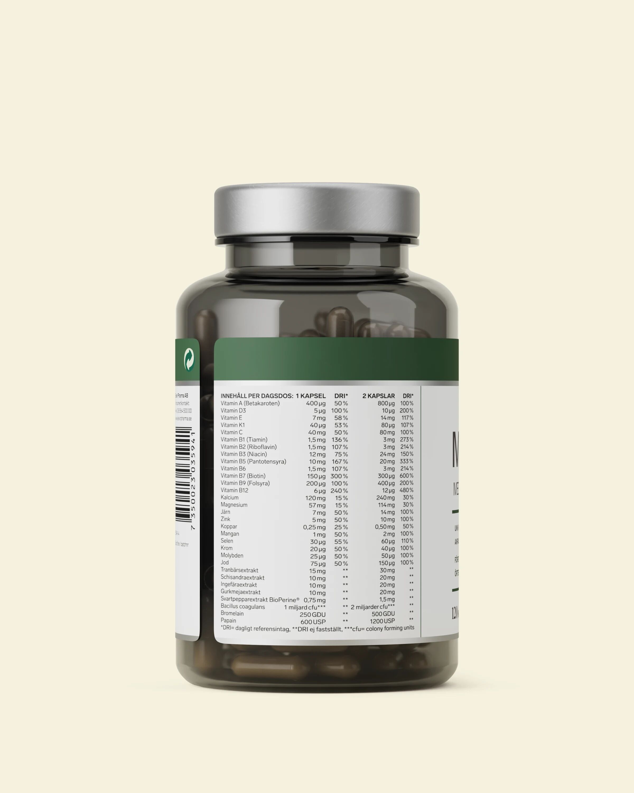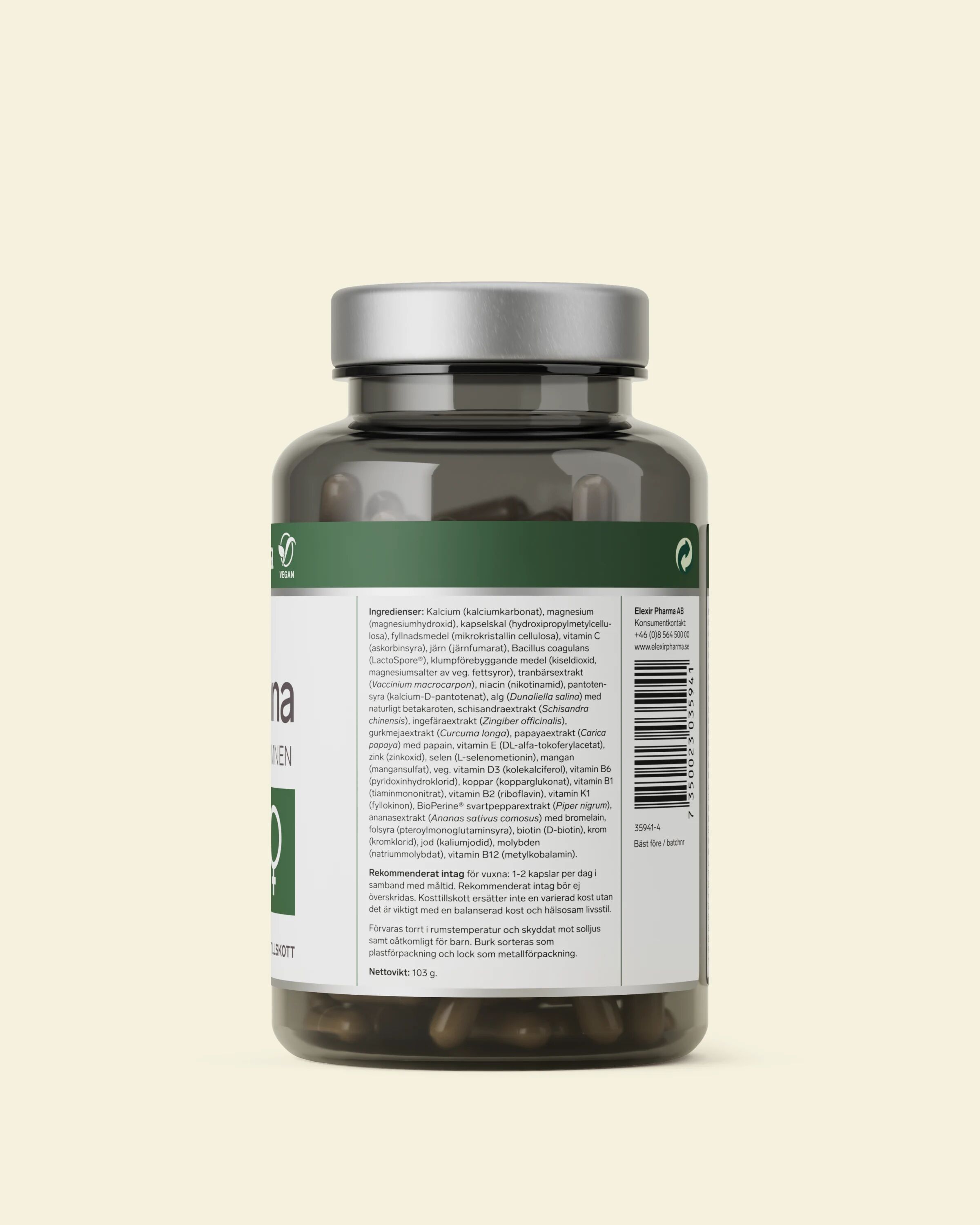 Ingredienser: Kalcium (kalciumkarbonat), magnesium (magnesiumhydroxid), kapselskal (hydroxipropylmetylcellulosa), fyllnadsmedel (mikrokristallin cellulosa), vitamin C (askorbinsyra), järn (järnfumarat), Bacillus coagulans (Lactospore®), tranbärsextrakt (Vaccinium macrocarpon), niacin (nikotinamid), pantotensyra (kalcium-D-pantotenat), schisandraextrakt (Schisandra chinensis), alg (Dunaliella salina) med naturligt betakaroten, ingefärsextrakt (Zingiber officinalis), gurkmejaextrakt (Curcuma longa), klumpförebyggande medel (kiseldioxid, magnesiumsalter av vegetabiliska fettsyror), papayaextrakt (Carica papaya) med papain, vitamin E (DL-alfa-tokoferylacetat), zink (zinkoxid), selen (L-selenometionin), mangan (mangansulfat), vitamin D (kolekalciferol), vitamin B6 (pyridoxinhydroklorid), koppar (kopparglukonat), vitamin B1 (tiaminmononitrat), vitamin B2 (riboflavin), vitamin K (fyllokinon), svartpepparextrakt (Bioperine®), ananasextrakt (Ananas sativus comosus) med bromelain, folsyra (pteroylmonoglutaminsyra), biotin (D-biotin), krom (kromklorid), jod (kaliumjodid), molybden (natriummolybdat), vitamin B12 (metylkobalamin).