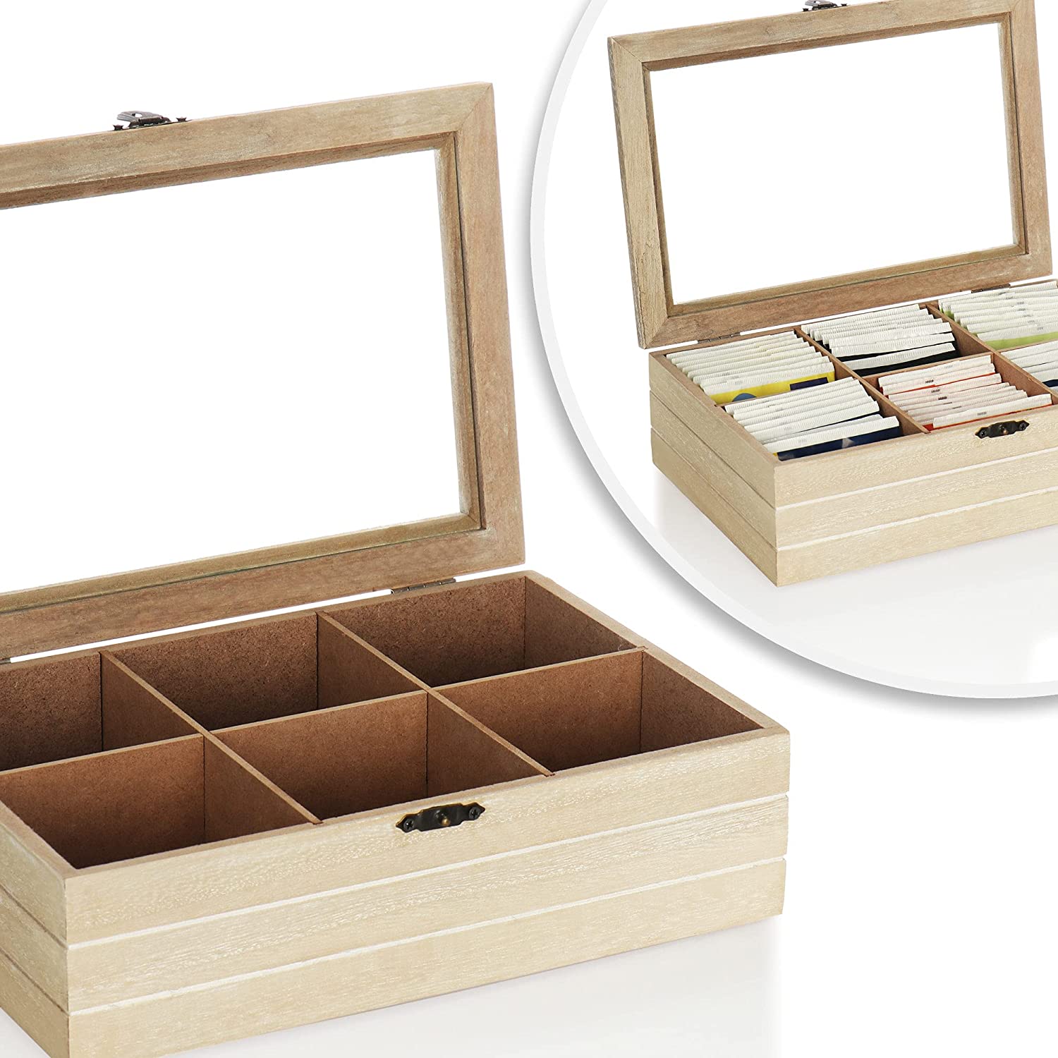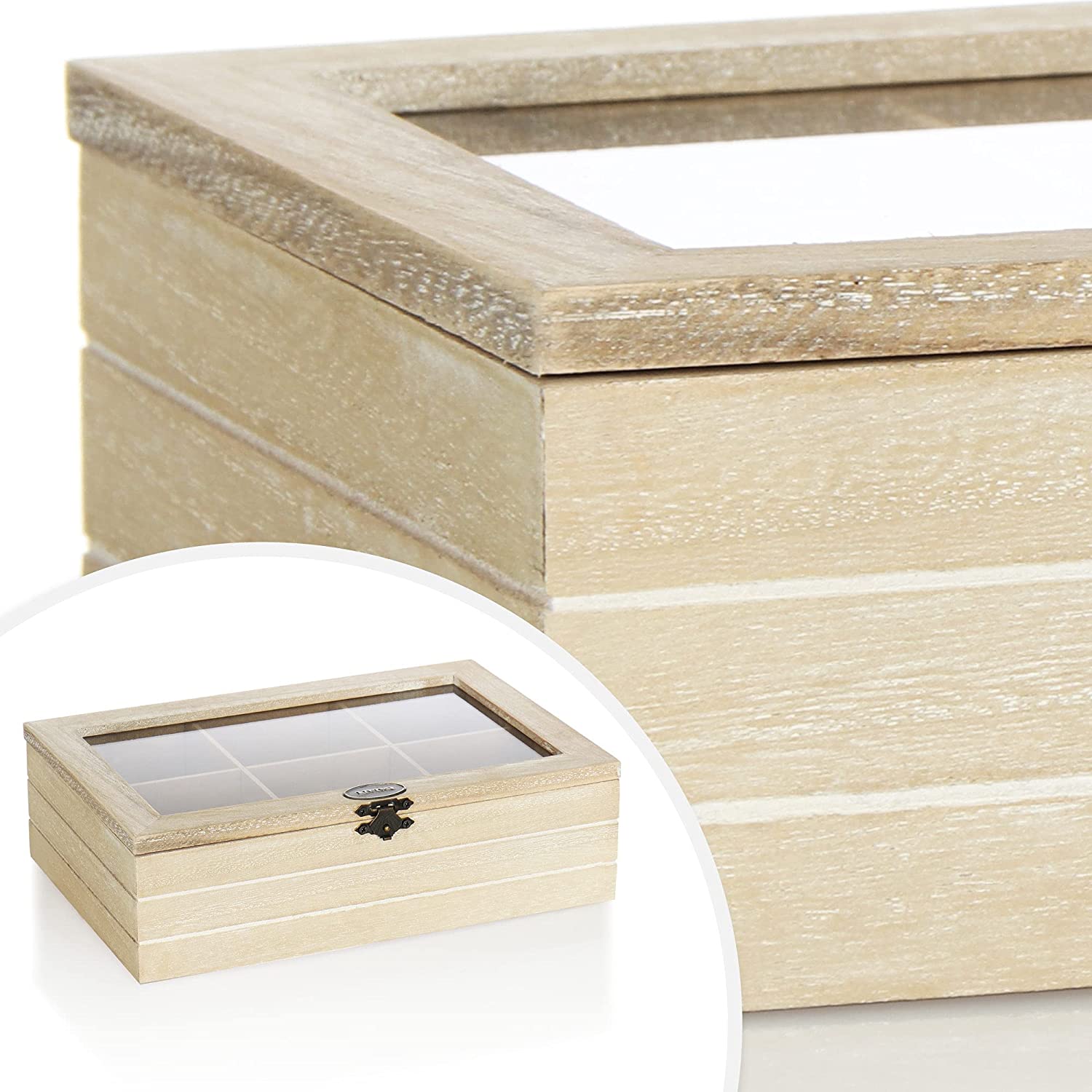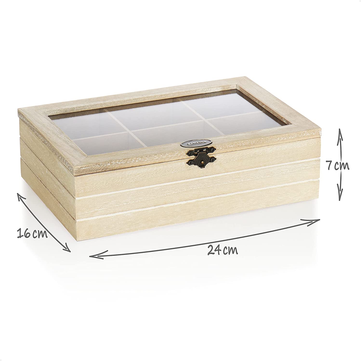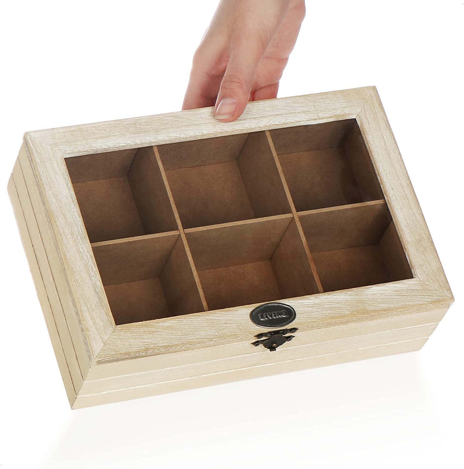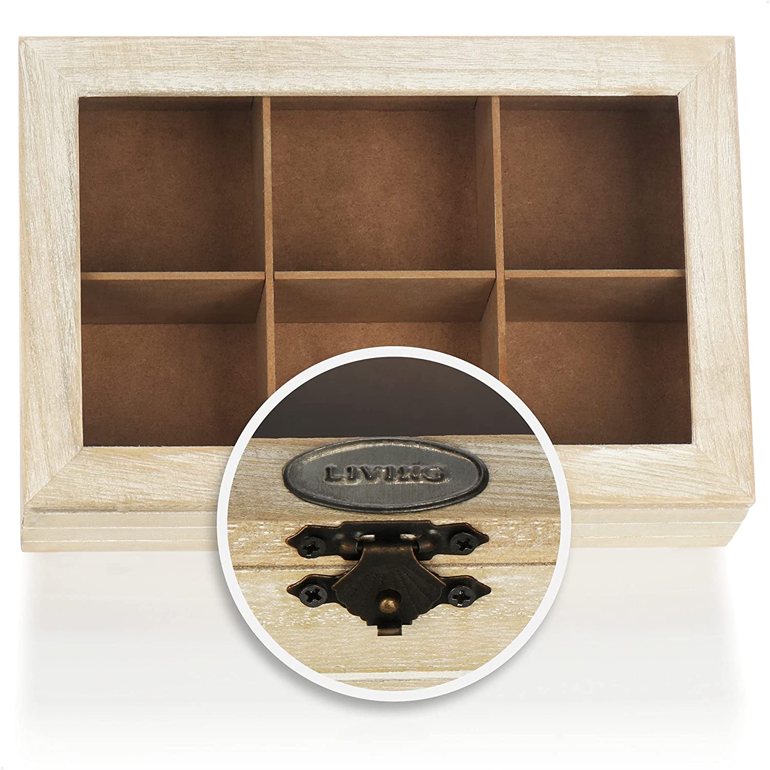 Mått: ca. 24 x 16 x 7 cm (bredd x djup x höjd) // Mått per fack (mätt inuti): ca. 7,2 x 7,2 x 5,9 cm // Material: trä, glas, metall // Färg: vit, transparent // Antal fack: 6