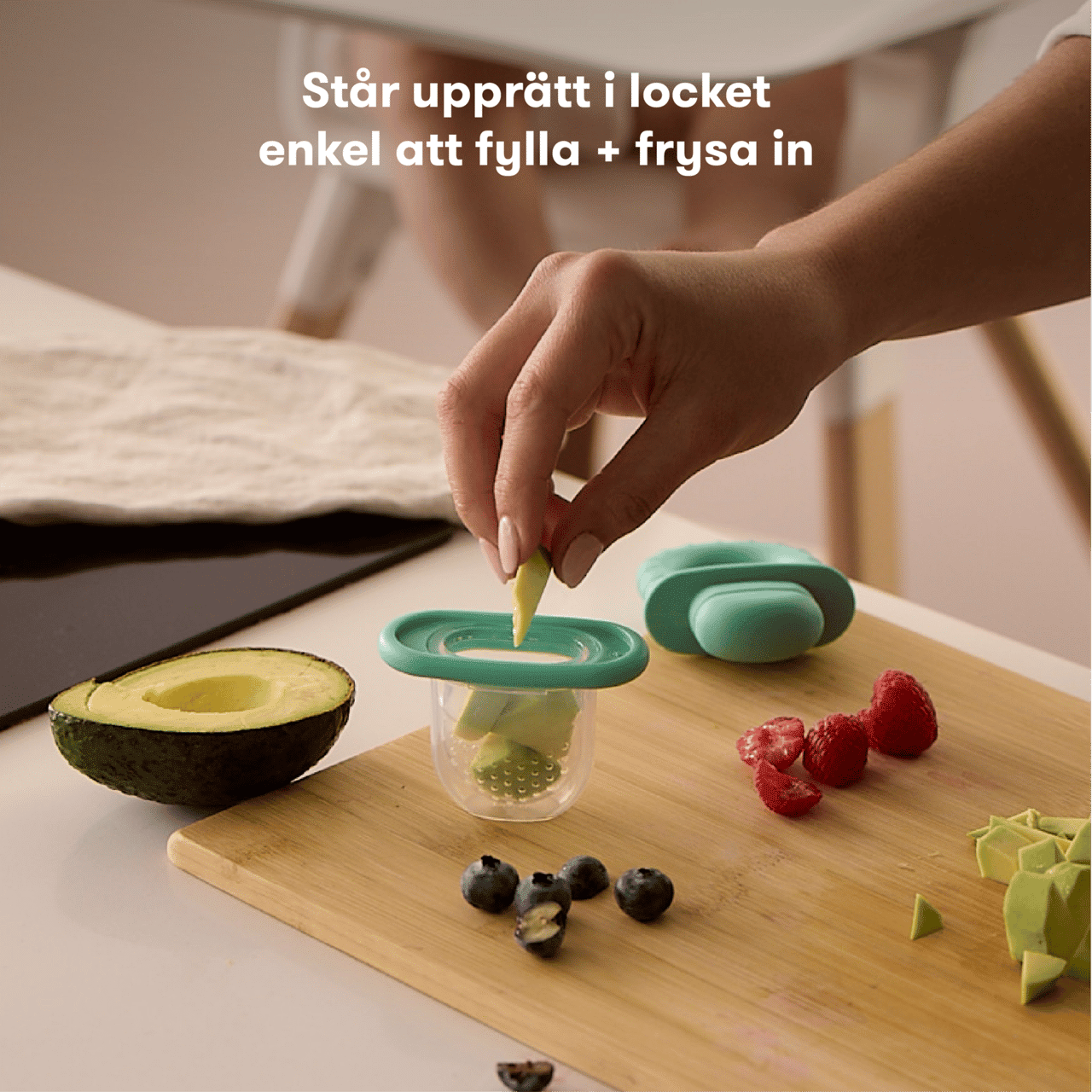 Fyll mataren med färska eller frysta frukter, grönsaker, yoghurt, puréer eller isbitar, variationen är stor. Ställ den upprätt i locket för enkel fyllning och förvaring. BPA-fri och lätt att greppa. Tål diskmaskin för enkel rengöring efter användning.