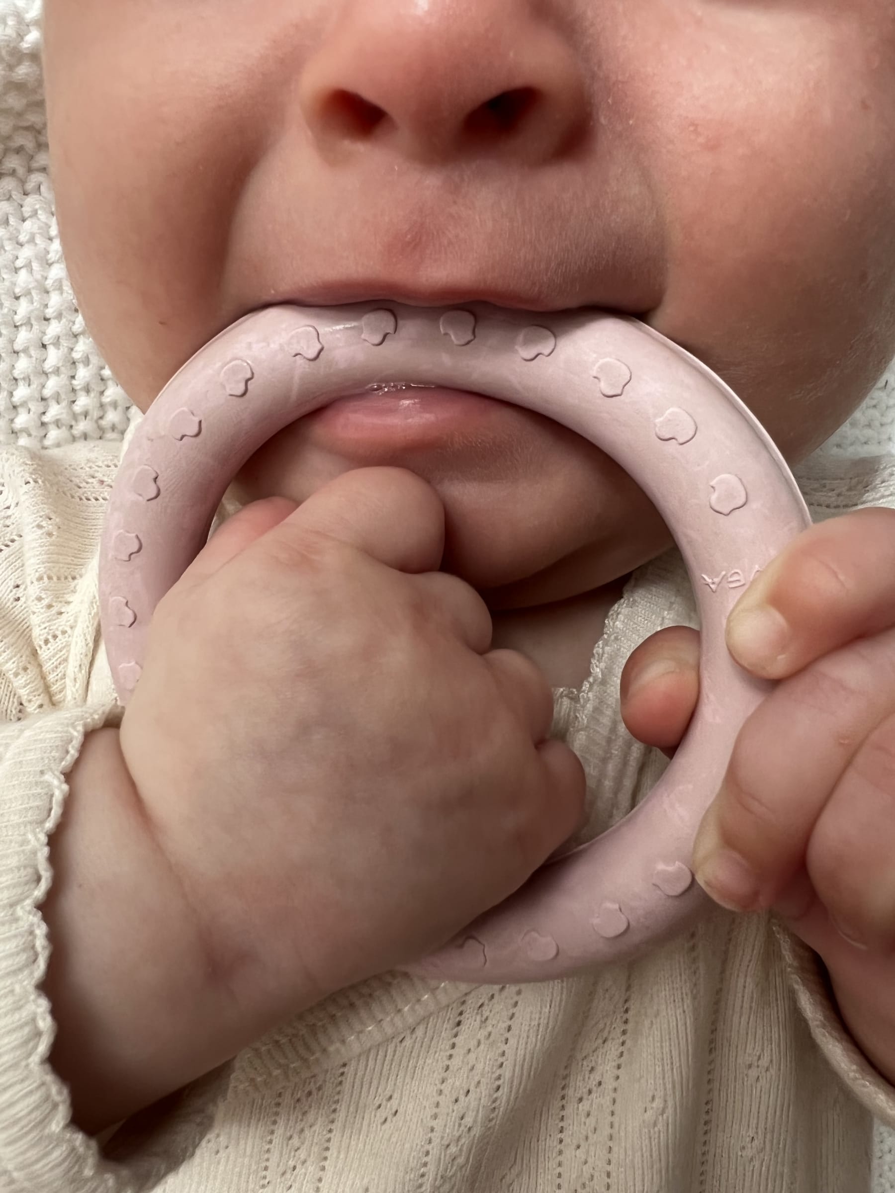 LÄTT ATT GREPA OCH HANTERA - ringen är lätt och lätt för bebisen att greppa och hålla upp mot munnen för att tugga - speciellt för tidiga bitringar i det skede i en bebis utveckling när de fortfarande utvecklar sin handkoordinationsförmåga!