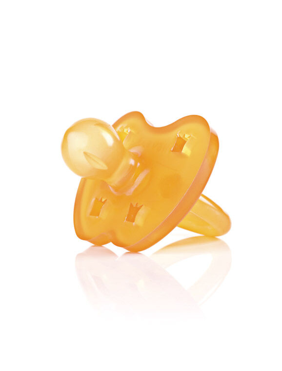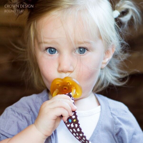 En napp i naturgummi som är fjärilsformad och har rund utformad sugdel. Detta är en napp som är stöpt i en enda form, vilket gör den hygienisk och lätt att rengöra. Nappar i naturgummi är naturligt mjuka och välsmakande i jämförelse med nappar av plast och silikon. Den här nappen har också praktiska och söta ventilationshål i form av kronor. Den här nappen kommer från gedigna Hevea baby.