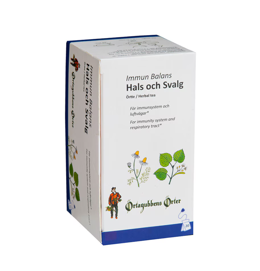 Kamomillblomma (Matricaria chamomilla) stödjer en lugnande effekt på hals och svalg, medan lindblomma (Tilia cordata) är känd för att verka svett- och slemlösande. Ingefära (Zingiber officinale) har värmande egenskaper och stödjer immunförsvaret. Citrongräs (Cymbopogon citratus) och timjangräs (Thymus vulgaris) är traditionellt använda örter vid förkylning.