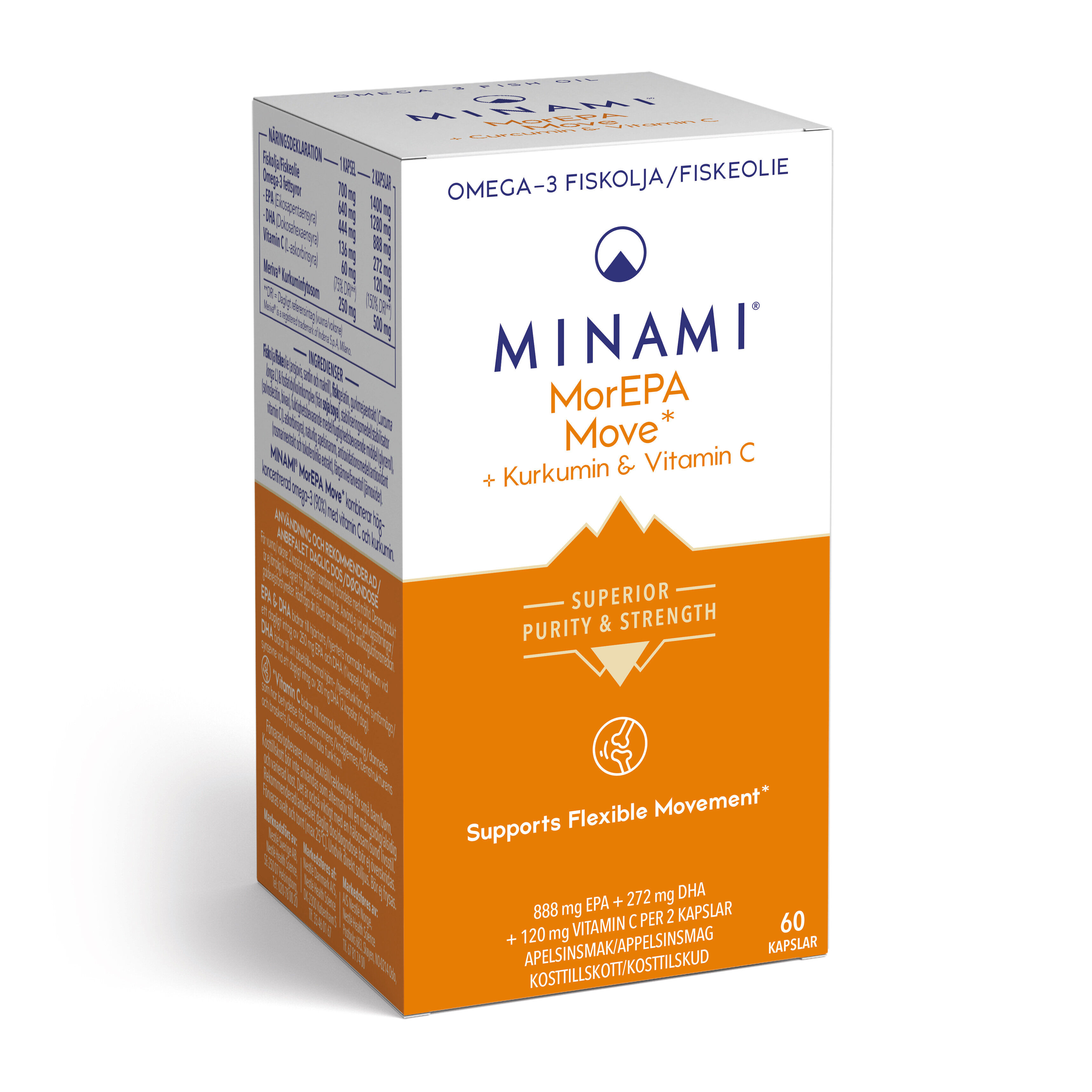 MorEPA MOVE för flexibla och rörliga leder är perfekt för aktiva personer och idrottare samt för äldre som vill bibehålla muskelmassa och bentäthet. MorEPA MOVE innehåller hög koncentration av EPA och DHA. Tillsammans med kurkuminextraktet Meriva, vitamin C och koppar är detta en unik kombination av inflammationsdämpande ämnen för bland annat flexibel rörelse och leder. Meriva är en patenterad variant av kurkumin som har 29 gånger högre upptag än kurkumin.