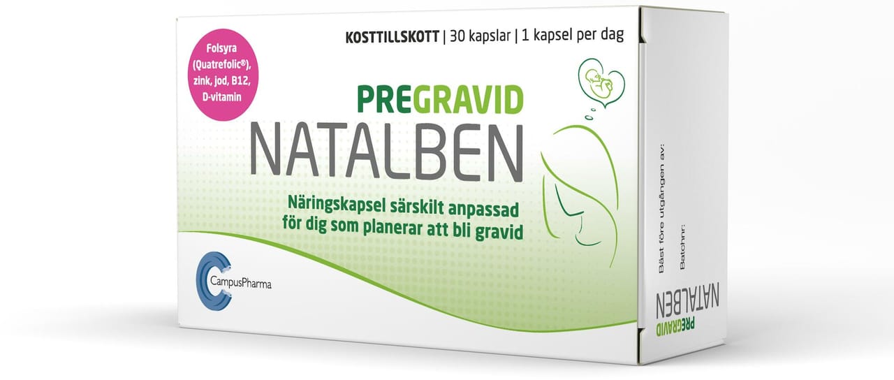 Natalben PreGravid är ett kosttillskott som har utvecklats särskilt för kvinnor som planerar att bli gravida. Varje kapsel innehåller folsyra (Quatrefolic®), zink, D-vitamin, vitamin B12 och jod.