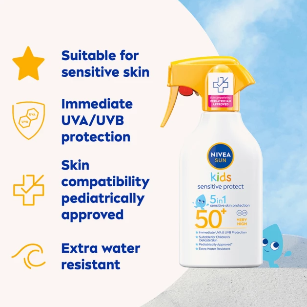 NIVEA SUN Kids Sensitive Protect & Play Sun Trigger Spray SPF 50+ är en solskyddsspray med mycket högt solskydd som är parfymfri och speciellt anpassad för barn och barns känsliga hud.