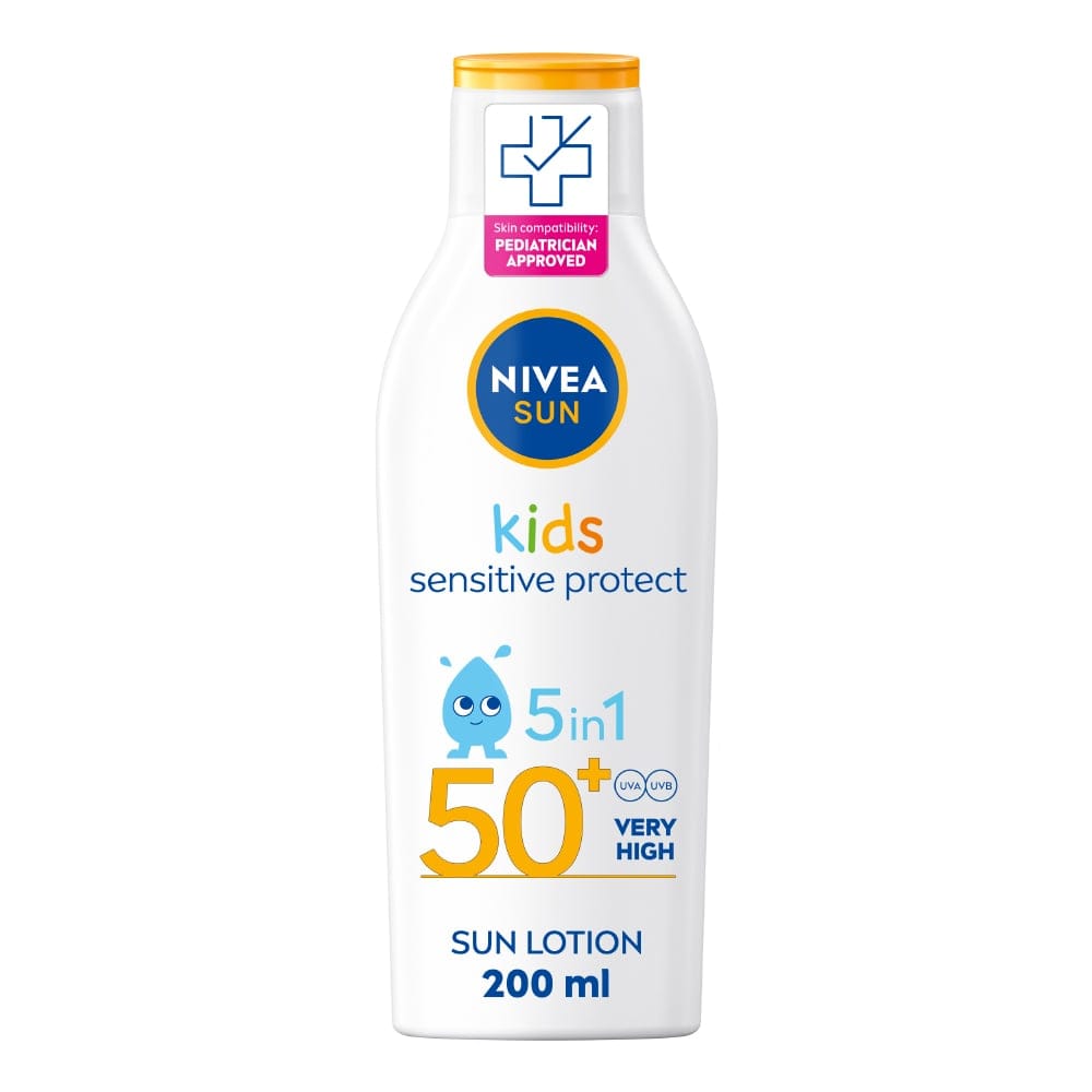 NIVEA SUN Kids Sensitive Protect & Play Sun Lotion SPF 50+ är solskyddskräm med mycket högt solskydd. Speciellt anpassad till barns känsliga hud, även eksembenägen hud. Dessutom minskar detta solskydd risken för solallergier. Ger ett omedelbart skydd mot UVA- och UVB-strålar och har en formula som innehåller ekologisk kamomill. Skyddar mot solbränna och långvariga hudskador. Den snabbt absorberande formulan är oparfymerad och extra vattenresistent. Detta NIVEA solskydd för barn är dermatologiskt testad och godkänd av barnläkare. Denna solkräm med Ocean Respect-formulan är 62% biologiskt nedbrytbar och fri från UV-filtren Octinoxate, Oxybenzone och Octocrylene. 50% återvunnen flaska (exklusive lock och etikett). Njut av lek, bad och familjetid!