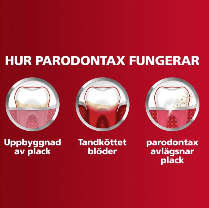Blödande tandkött kan orsakas av en uppbyggnad av plack längs tandköttskanten. Om man inte tar bort detta plack kan det leda till dålig andedräkt, och till att tandköttet blir rött och svullet. Använd Parodontax kontinuerligt två gånger dagligen för att motverka problem med blödande tandkött.