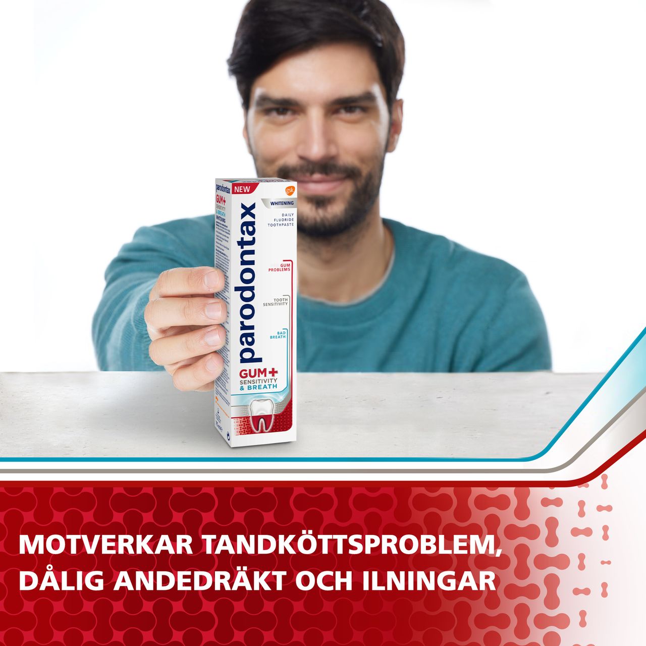 Parodontax Gum+ Sensitivity & Breath Whitening inte bara skyddar tandköttsproblem utan riktar även in sig mot dålig andedräkt och ilningar som tandköttsproblem kan orsaka.