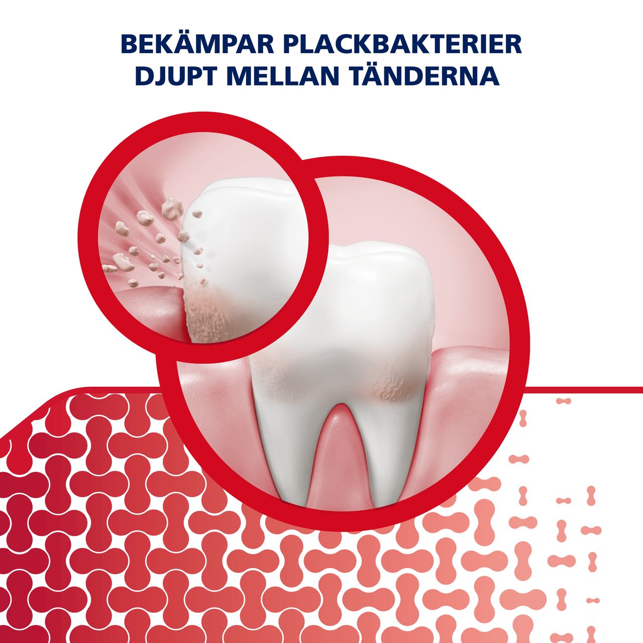 1. Riktar in sig på plackbakterier djupt mellan tänderna