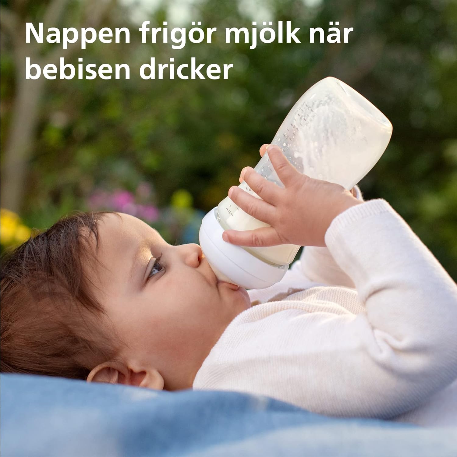 Den breda, mjuka och flexibla nappen är utformad för att se ut och kännas som ett bröst, vilket underlättar för bebisen att få tag och dricka.