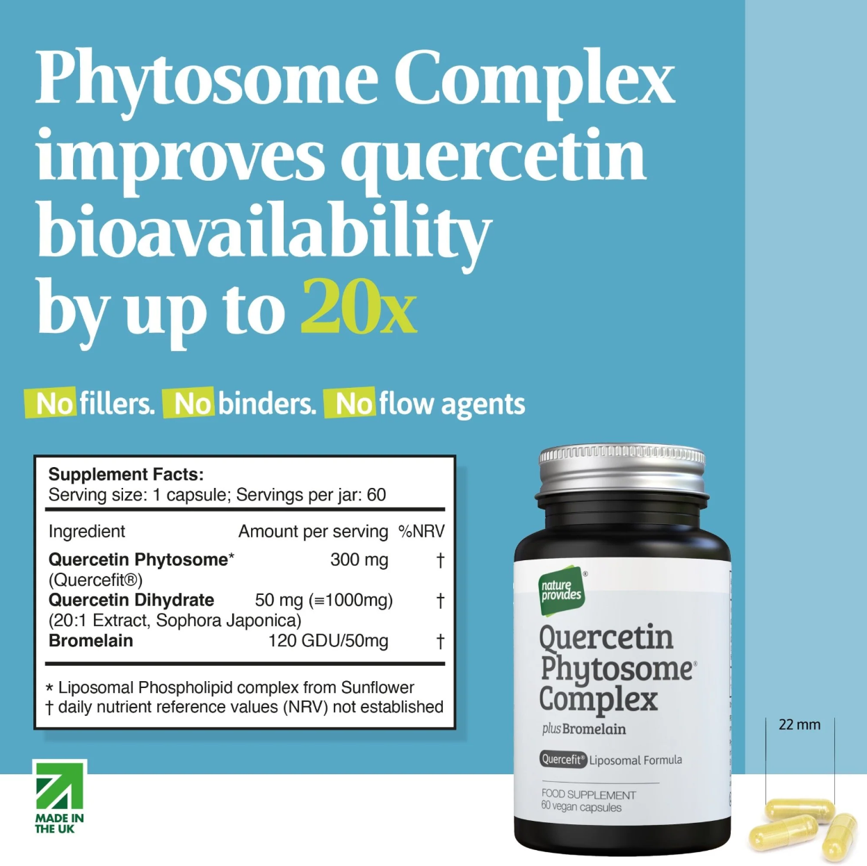 Ingredienser: Quercetin Phytosome, Quercetin Dihydrat, Bromelain, Grönsakskapsel (HPMC).