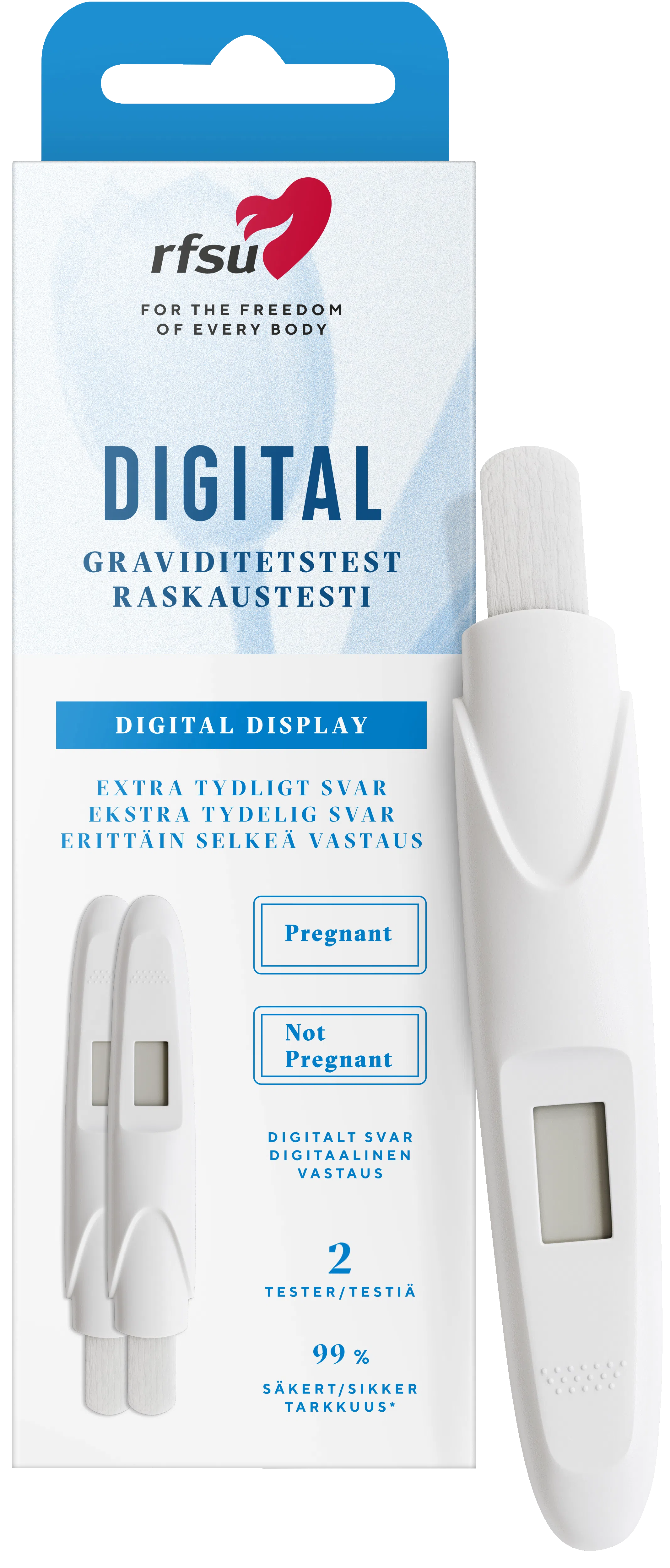 RFSU Digitalt Graviditetstest 2-pack är framtaget för dig som vill ha ett otvetydigt svar utan att behöva tolka färgade streck. Istället för streck visar den digitala skärmen texten "Pregnant" eller "Not Pregnant", vilket ger en extra trygghet i en av livets viktigaste stunder. Testet är utformat med en extra bred spets för att underlätta provtagningen direkt i urinstrålen.