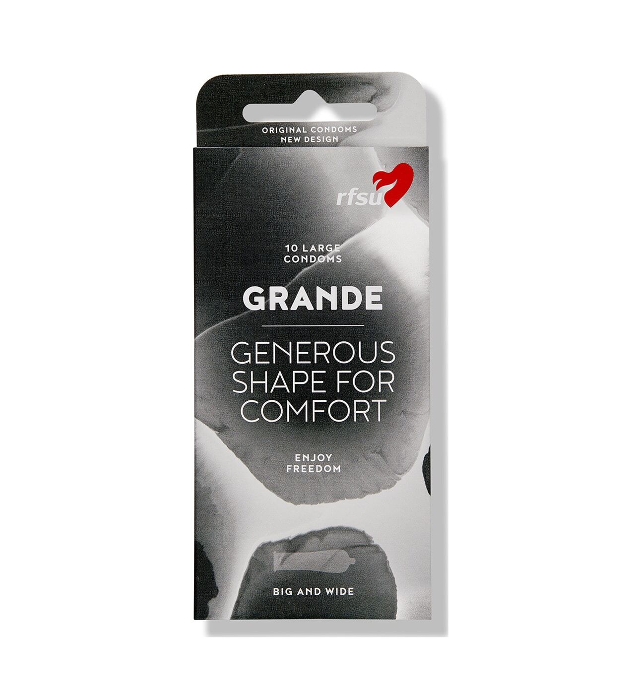 Något längre, bredare och tjockare kondom. Favoriten för de som önskar en rymligare känsla. RFSU Grande är extra rymliga och säkra kondomer med generös form som ger bättre passform och känsla! Ofärgad latexkondom med slät yta, behållare och glidmedel. Bredd 55 mm