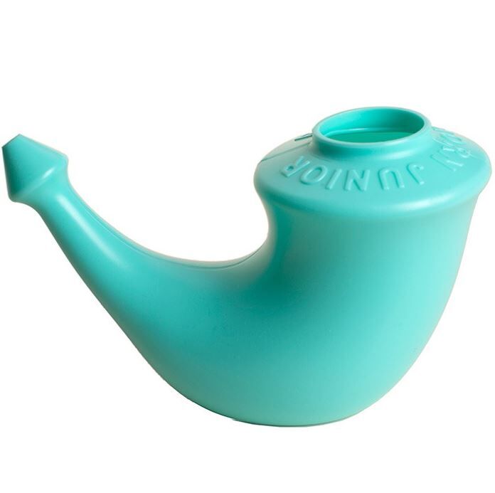 Häll ett struket mått (mått medföljer) vanligt jodfritt salt i kannan. (Använd vanligt koksalt eller fint havsalt - inte Seltin eller jodsalt.) Fyll kannan med kroppstempererat vatten. Håll för kannans öppningar och skaka kannan så att allt saltet löses upp. För pipen in i den mest öppna näsborren - från sidan, inte framifrån - och tryck lätt upp i näsborren så att det sluter tätt runt pipen. Andas genom munnen. Böj lite från höften så att huvudet kommer över vasken. Se till att hakan kommer in mot kroppen. (Sträck inte fram hakan.) Vrid huvudet åt sidan och kom ihåg att hålla in hakan. Vattnet rinner nu in i den ena näsborren och ut genom den andra. När ca hälften av vattnet har gått igenom, räta upp huvudet och ta bort kannan. Lite vatten kommer nu att rinna ut ur näsan och du tömmer resten genom att stänga ena näsborren och blåsa försiktigt genom den andra. Därefter stänger du den andra och blåser försiktigt. Blås inte så kraftigt att det klickar eller smäller i öronen. Resten av vattnet hälls nu igenom den andra näsborren. Se till att allt vatten kommer ut ur näsan och bihålorna efter sköljningen. Gör på samma sätt med den andra sidan och näsborren. Skölj rent och lufttorka kannan efter användning.