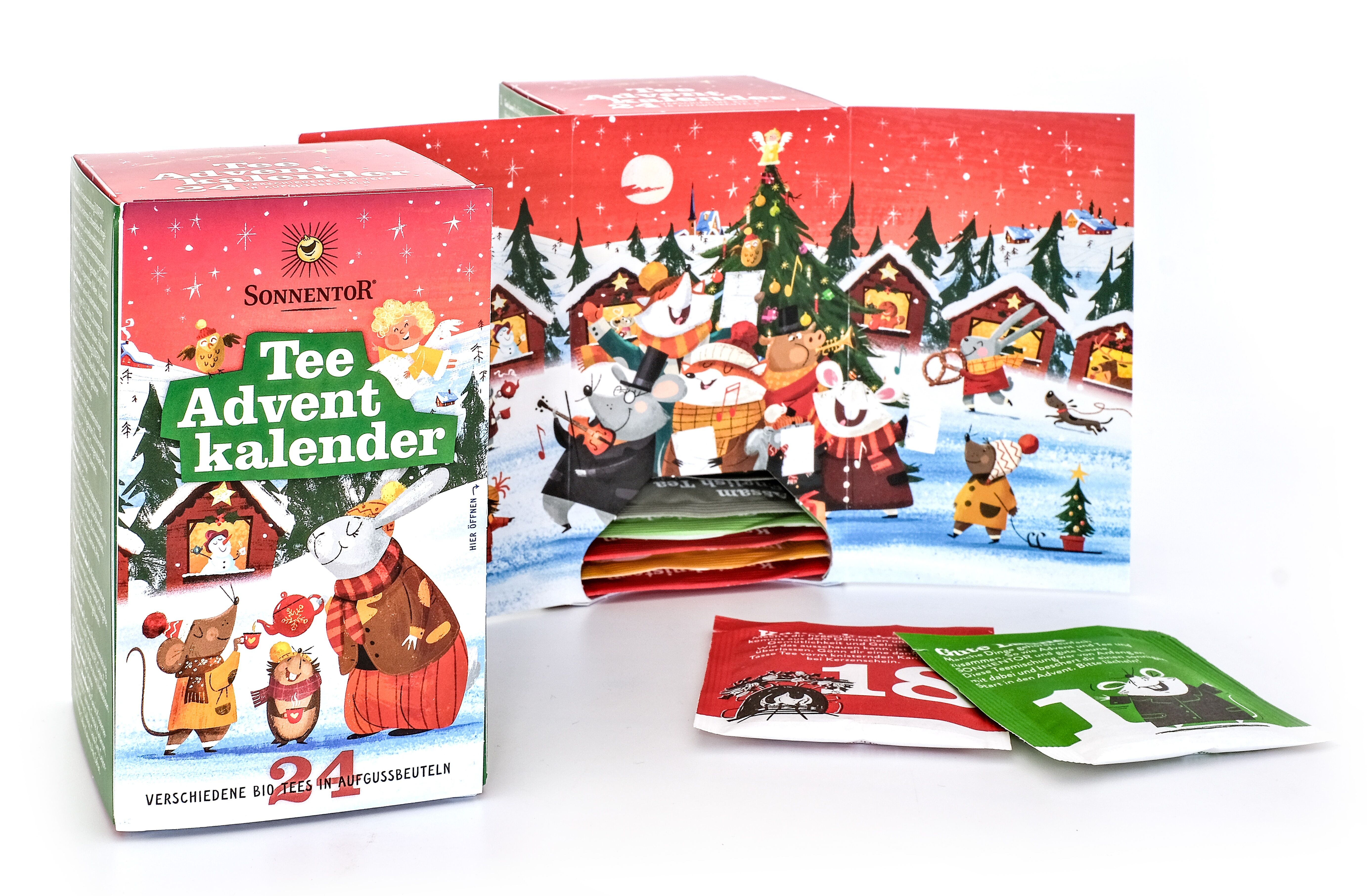 24 | Himmelskt julte (Himmlischer Christindkl Tee). Ekologiska ingredienser: Ceylonkanel, citronmeliss, björnbärsblad, apelsinskal, äppelbitar, lakritsrot, kryddnejlika, blåklint, ringblomma. |
