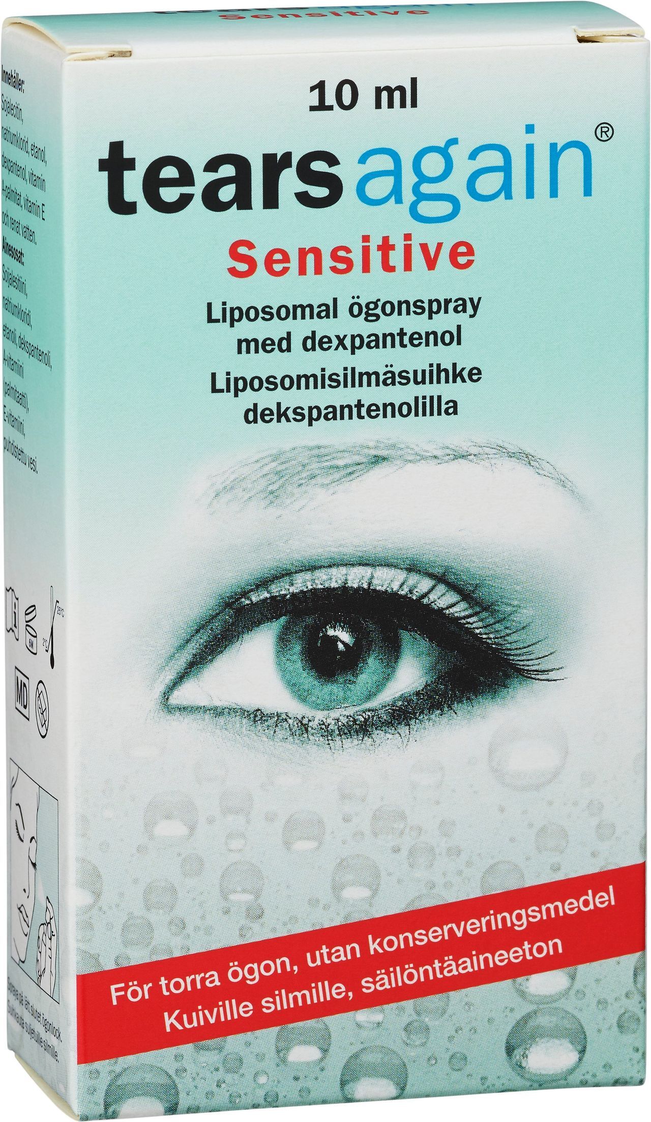 OBS! Sprayas på lätt slutet öga! 1-2 sprayningar på ögonlock 3-4 gånger dagligen. Håll spraymunstycket minst 10 cm från ögat. Blunda och spraya över lätt slutet öga. Efter sprayning blandas liposomerna (små fettpartiklar) från tearsagain Sensitive med de kroppsegna lipiderna vid ögonlockskanten i springan mellan övre och undre ögonlocket. Öppna ögat och tearsagain Sensitive fördelas tillsammans med tårfilmen över ögats yta och därmed repareras och stabiliseras det defekta lipidskiktet.