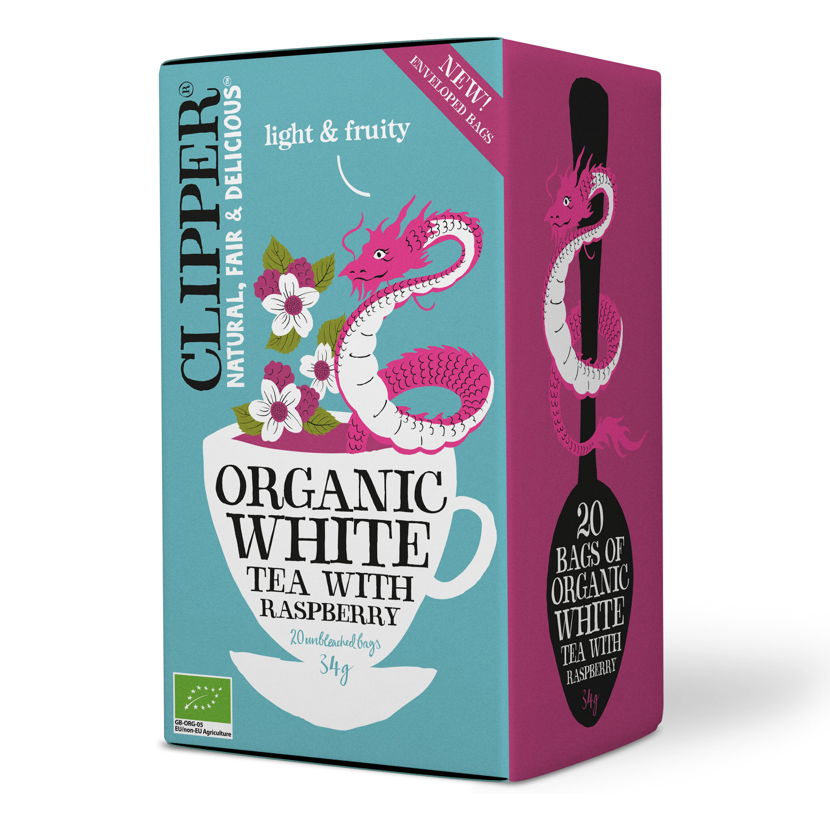 Ingredienser: Vitt te*, naturlig hallonarom med andra naturliga aromer (5%), hallonbitar* (1%). *Ekologisk